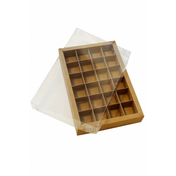 Коробка для 24 цукерок крафтова, з бортиком і прозорою пластиковою кришкою, 275*190*30